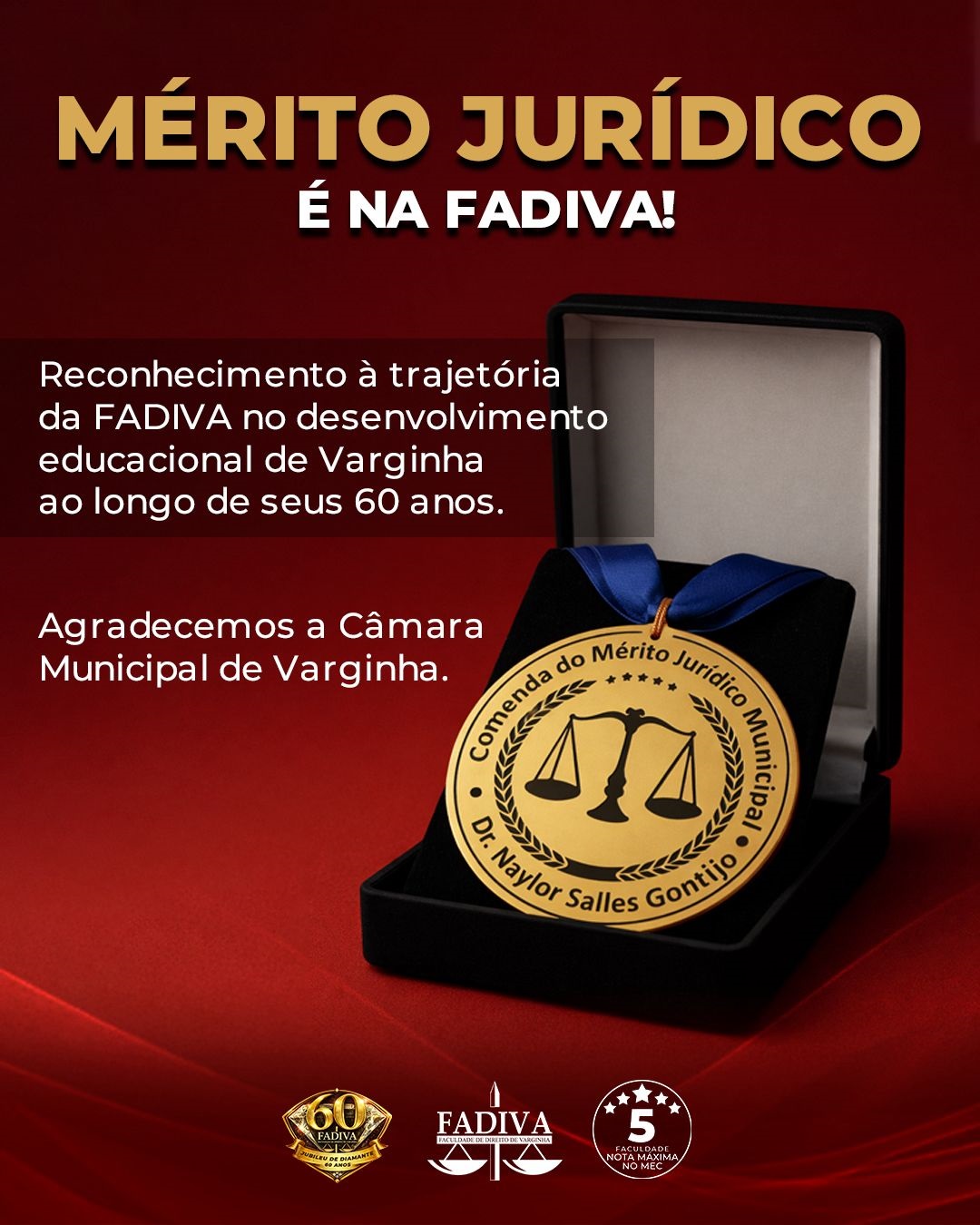 É uma grande honra o reconhecimento da Câmara Municipal de Varginha pelos seus 60 anos de contribuição ao desenvolvimento educacional e jurídico da nossa cidade.
